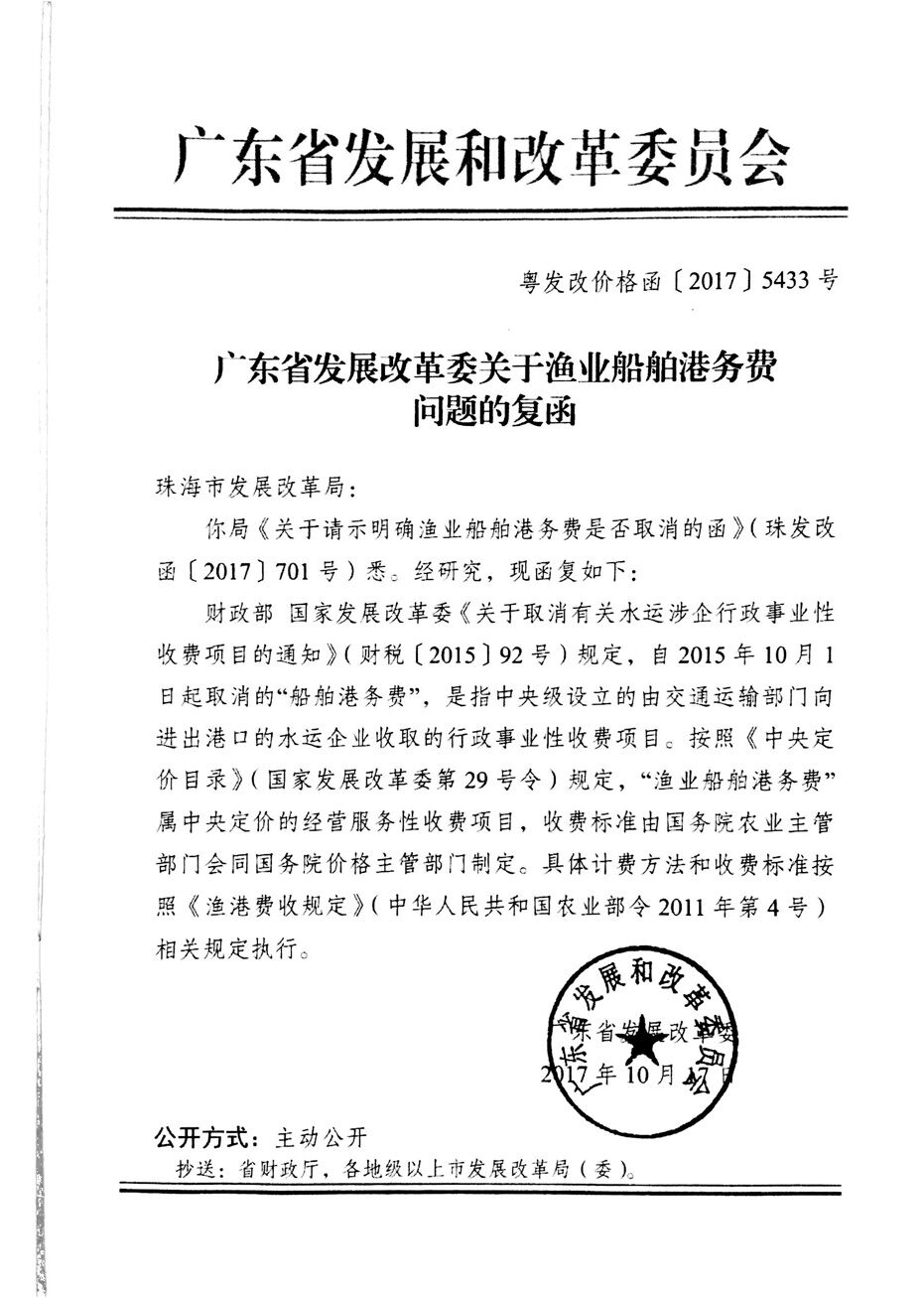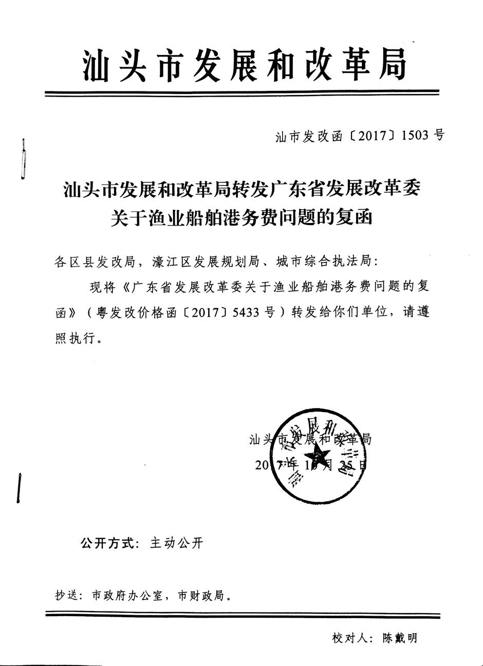 潮陽區(qū)發(fā)展和改革局轉(zhuǎn)發(fā)關(guān)于漁業(yè)船舶港務(wù)費問題的復(fù)函的通知
