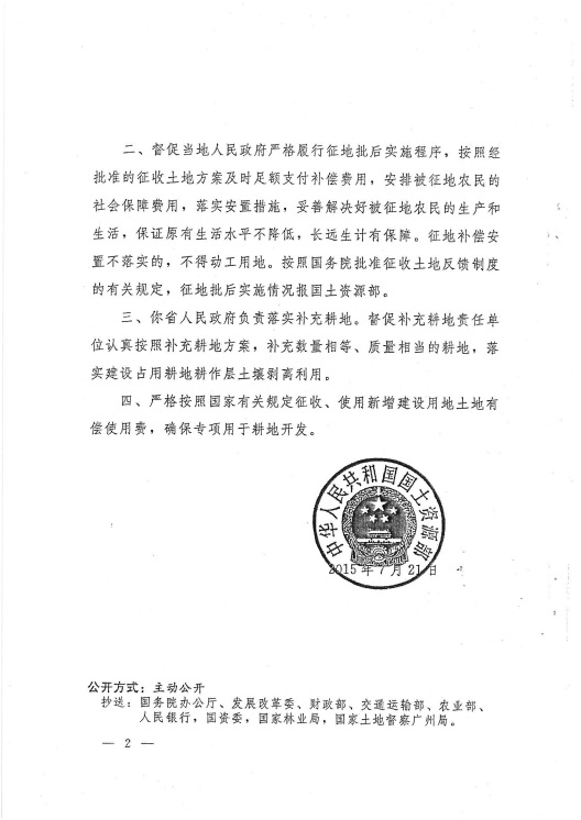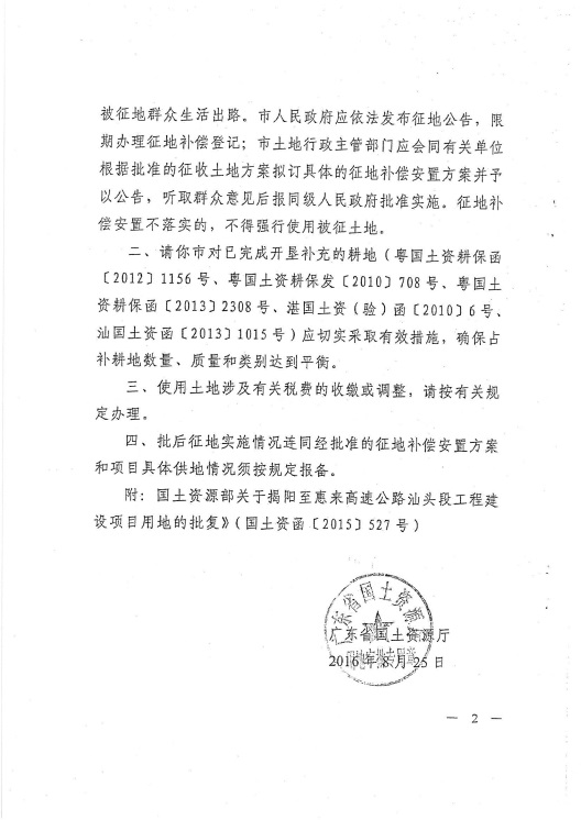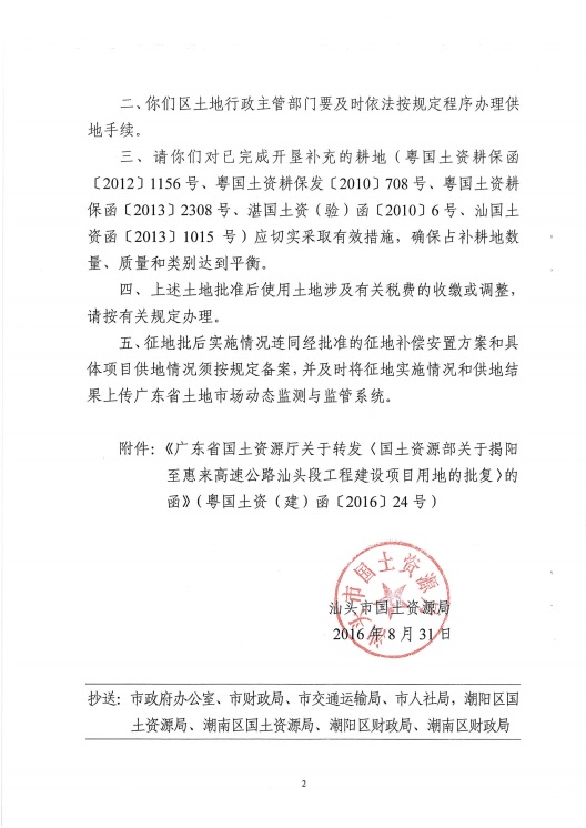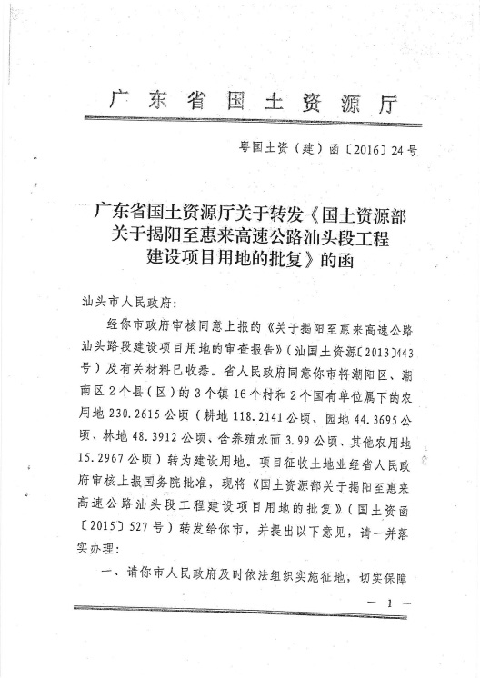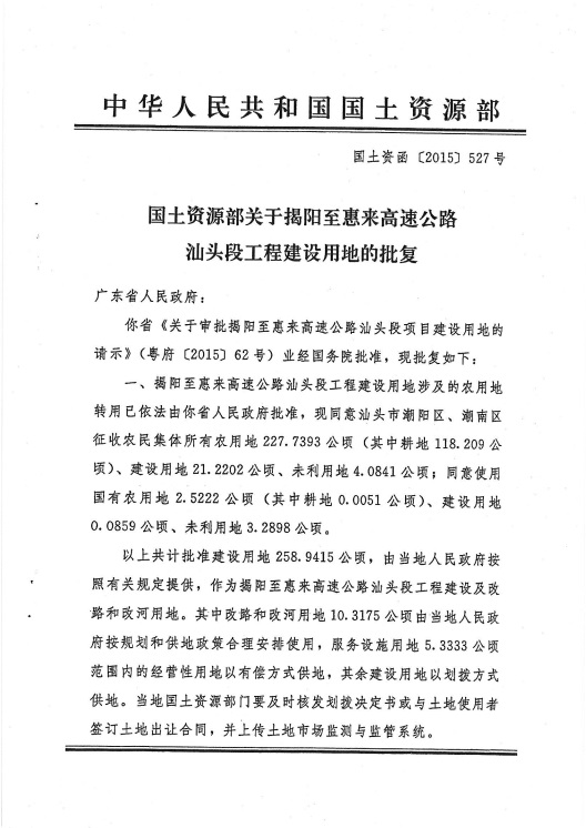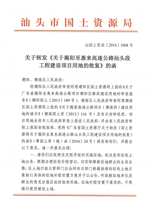 揭陽至惠來高速公路(潮陽段)工程建設(shè)項目用地批復(fù)(國務(wù)院、省、市)
